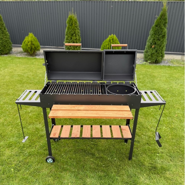 Конструкція підходить для тих, хто хоче поєднати класичний шашлик та сучасні можливості гриля в одному пристрої.