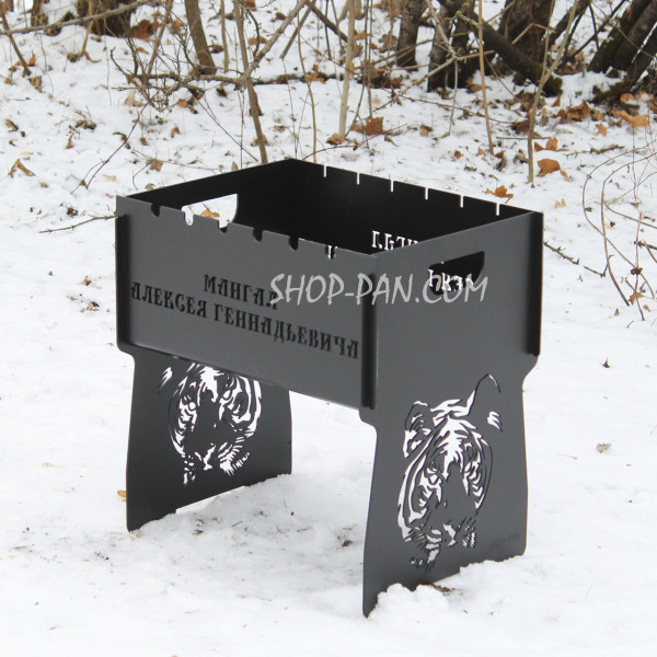 Компактний мангал виготовлений з якісного металу, прослужить не одне десятиліття. Вигравіювати на ньому можна все що завгодно: ініціали власника, побажання, мотивуючі фрази або жартівливий підпис, якій оцінить ваш близький друг.