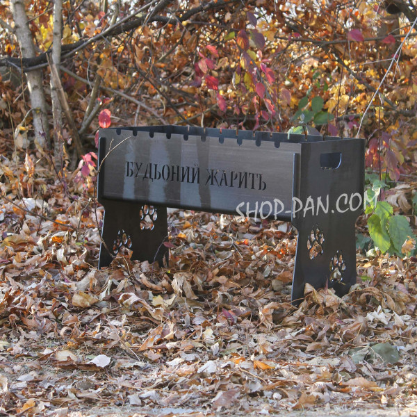 Компактний мангал виготовлений з якісного металу, прослужить не одне десятиліття. Вигравіювати на ньому можна все що завгодно: ініціали власника, побажання, мотивуючі фрази або жартівливий підпис, якій оцінить ваш близький друг.