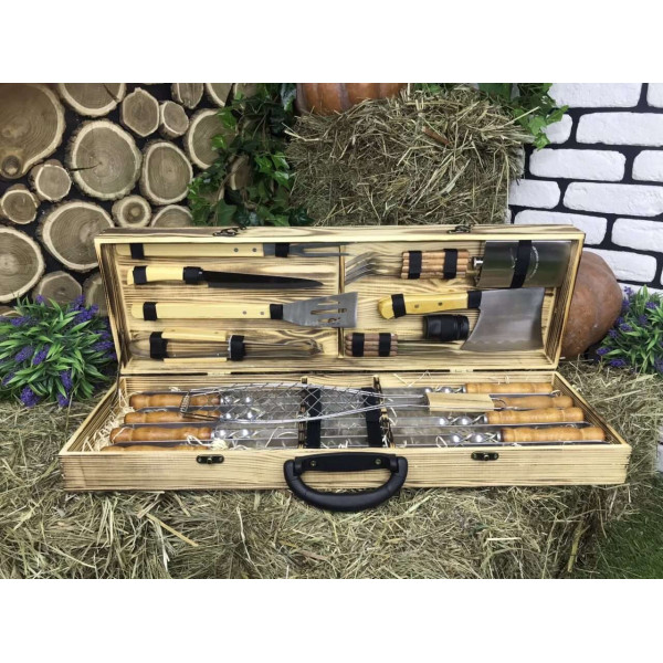 Презентабельний, тому що упакований в красивий дерев'яний кейс. Корисний, тому що максимально спростить приготування страв. Функціональний, тому що в кейсі є все необхідне для приготування різноманітних страв на мангалі або грилі.