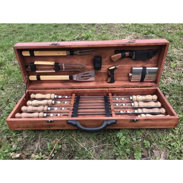 шампура, щипці-гриль, лопатка-гриль, вилка для зняття м';яса, ніж, запальничка, штопор, фляга, чарки