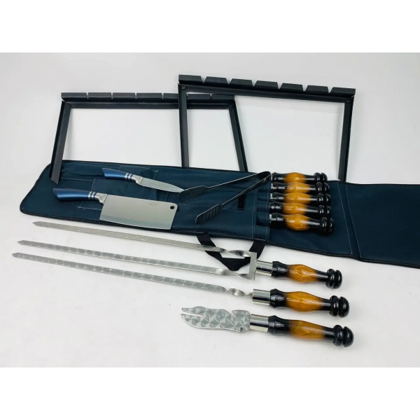 шампура, подвійний шампур, виделка для зняття м'яса, ніж-сікач, ніж, щипці-гриль, мангал-підставка