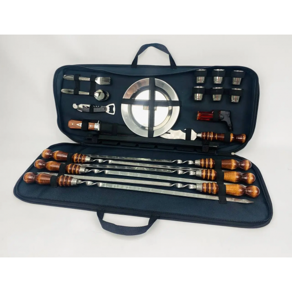шампура, виделка для зняття м'яса, ніж, тарілки, виделки, ложки, чарки, запальничка. штопор