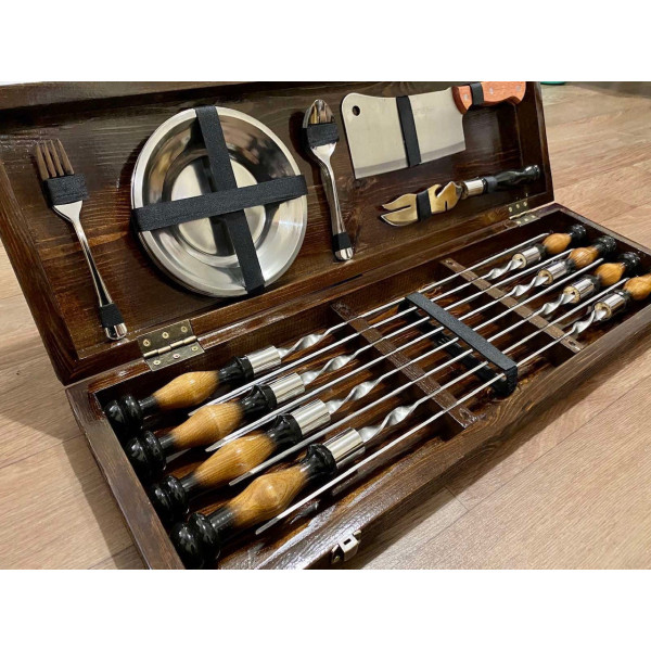 Такий набір шампурів створить WOW-ефект ще до його відкриття. Тільки побачивши дерев'яний кейс, майбутній володар набору отримає безмежний вибух захоплення і незабутніх емоцій.