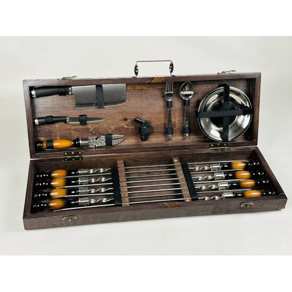 Презентабельний, тому що упакований в красивий дерев'яний кейс. Корисний, тому що максимально спростить приготування страв. Функціональний, тому що в кейсі є все необхідне для приготування різноманітних страв на мангалі або грилі.