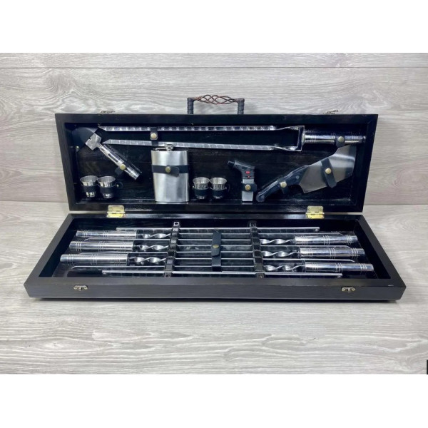 шампура, подвійний шампур, ніж-сікач, запальничка, фляга, чарки, вилка для зняття м';яса