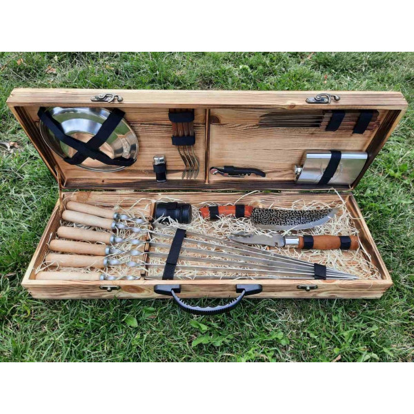 Презентабельний, тому що упакований в красивий дерев'яний кейс. Корисний, тому що максимально спростить приготування страв. Функціональний, тому що в кейсі є все необхідне для приготування різноманітних страв на мангалі або грилі.