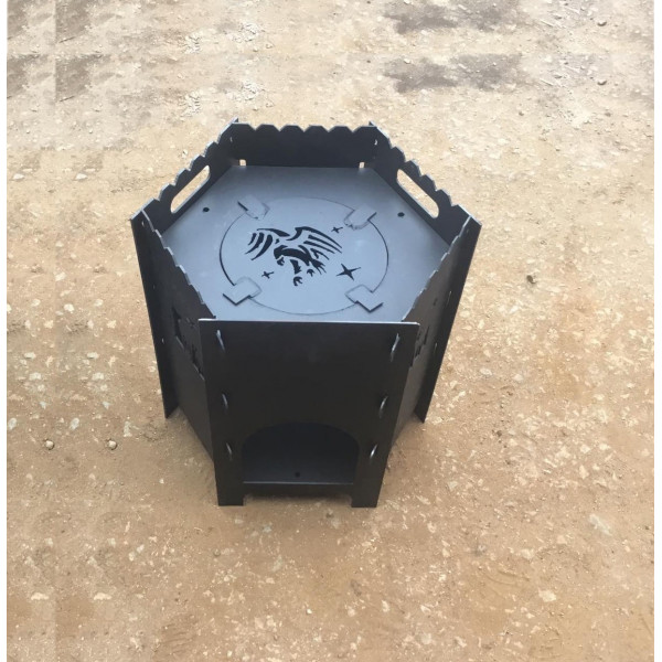Конструкція розбирається на 8 елементів: 6 секцій, що становлять основу у вигляді шестигранника; 2 пластини (перегородки) - дно печі та підставка під казан.