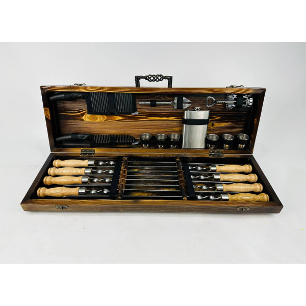 шампура, ніж, виделка для зняття м'яса, ніж-сікач, штопор, фляга, чарки 6 шт