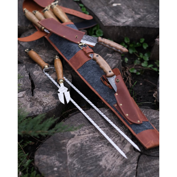 Використовуються лише натуральні матеріали: нержавіюча сталь, якісна шкіра, бронза, дерево (дуб). Жодного пластику! Ручки шампурів прикрашені головами тварин, виконаними у техніці художнього лиття. Все упаковане в стильний чохол із натуральної шкіри.