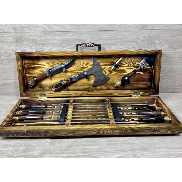 Презентабельн, потому что упакован в красивый деревянный кейс. Полезен, потому что максимально упростит приготовление блюд. Функционален, потому что в кейсе есть все необходимое для приготовления разнообразных блюд на мангале или гриле.