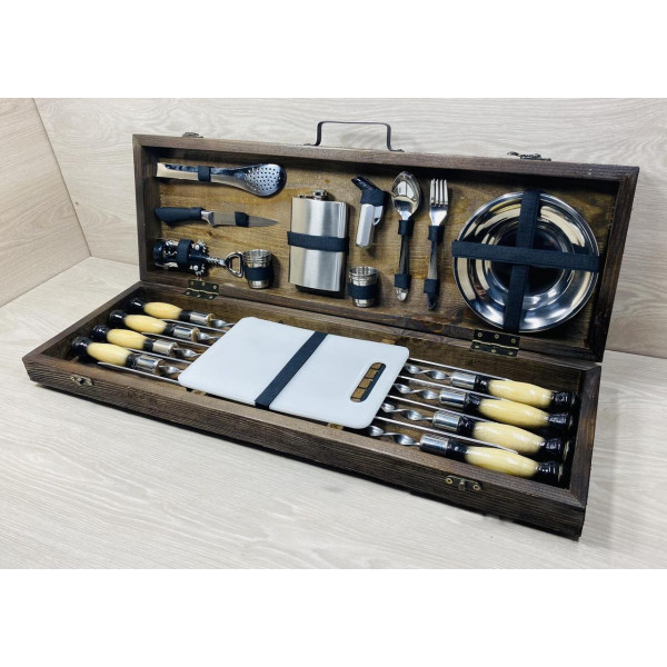 Презентабельн, потому что упакован в красивый деревянный кейс. Полезен, потому что максимально упростит приготовление блюд. Функционален, потому что в кейсе есть все необходимое для приготовления разнообразных блюд на мангале или гриле.