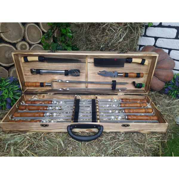 Презентабельн, потому что упакован в красивый деревянный кейс. Полезен, потому что максимально упростит приготовление блюд. Функционален, потому что в кейсе есть все необходимое для приготовления разнообразных блюд на мангале или гриле.