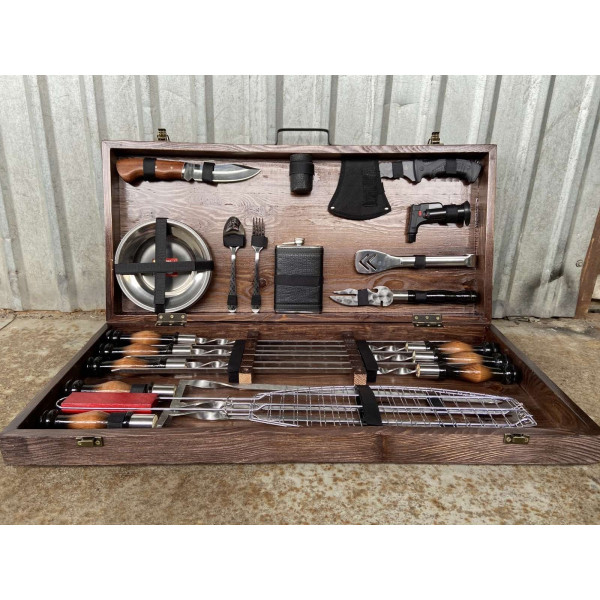 Набор шампуров упакован в презентабельный деревянный кейс, что придает такому подарку еще больше премиальности.