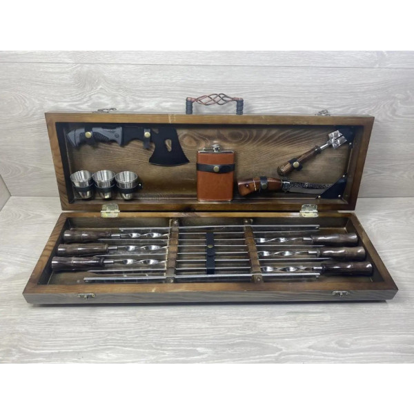 шампура, нож, вилка для снятия мяса, фляга, рюмки, мангал-подставка, топор