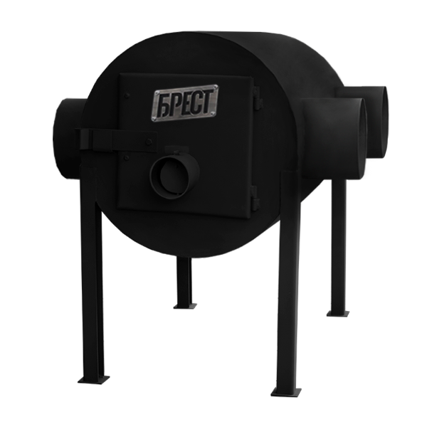 Если необходимо отапливать одновременно несколько смежных помещений, то лучшим выбором будет буржуйка Брест 203 с горизонтально расположенными тепловыми патрубками. Одно помещение отапливается непосредственно самой буржуйкой, а соседние помещения от патрубков производят гофро-трубу. Температура на выходе из булерьян достигает 80-120 0С. Для того чтобы вентилятор не вышел из строя его необходимо располагать ниже топки на расстоянии более 1м. Снаружи печь окрашена жаростойкой краской.
