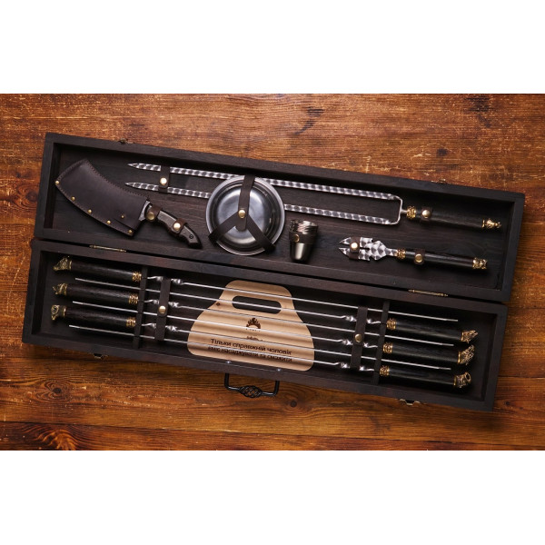 Используются только натуральные материалы: нержавеющая сталь, качественная кожа, бронза, дерево. Никакого пластика! Ручки шампуров украшены головами животных, выполненными в технике художественного литья. Все упаковано в стильный кейс из натурального дерева.
